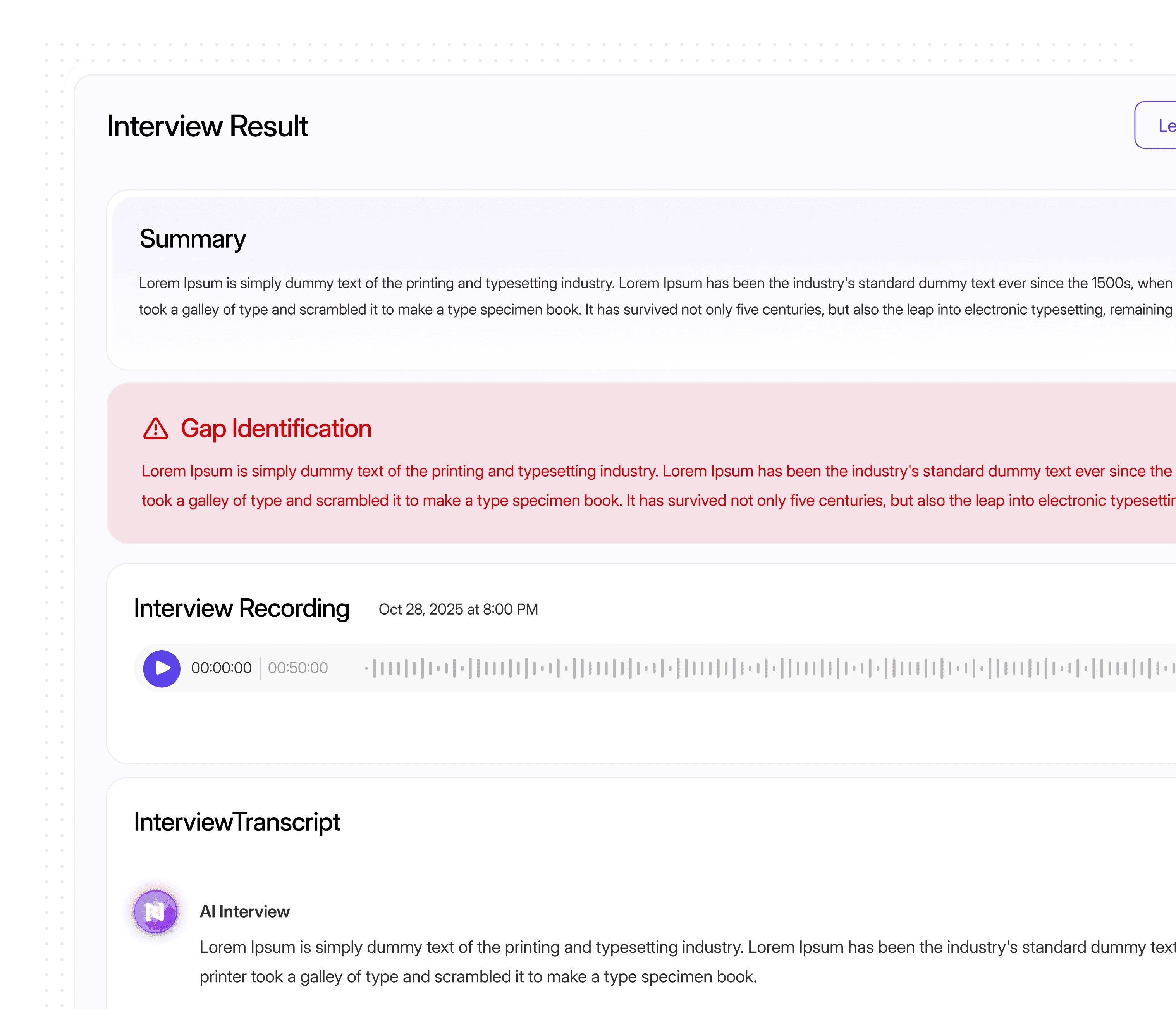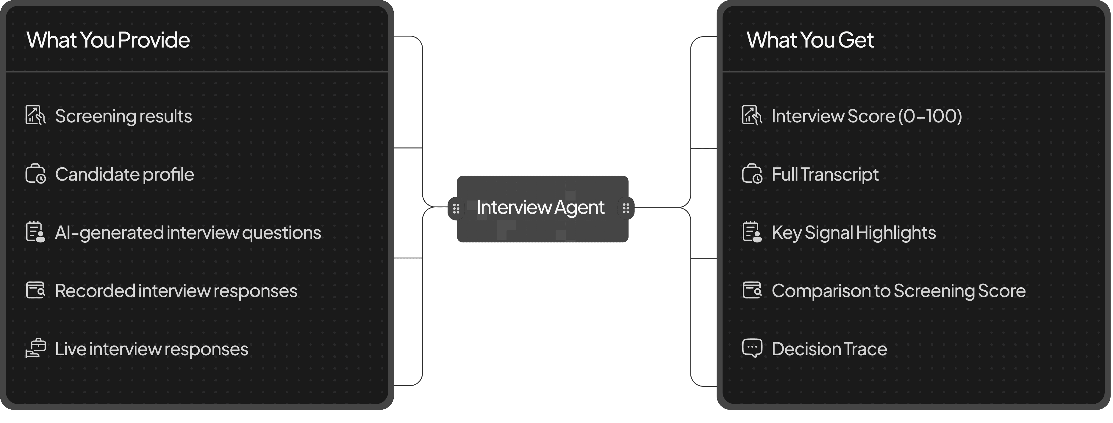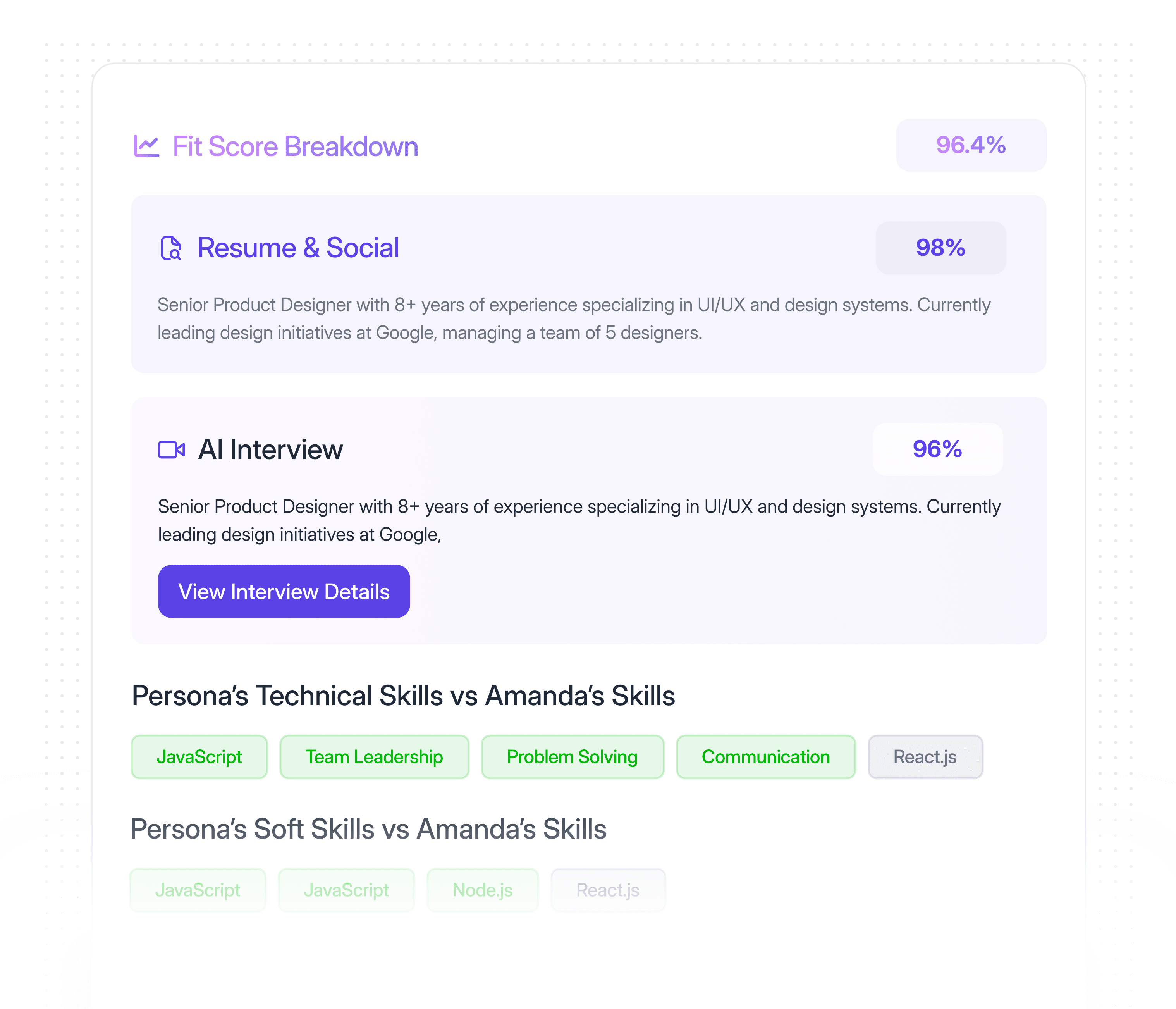 Captures full interview transcripts and decision traces, showing exactly why a recommendation was made.