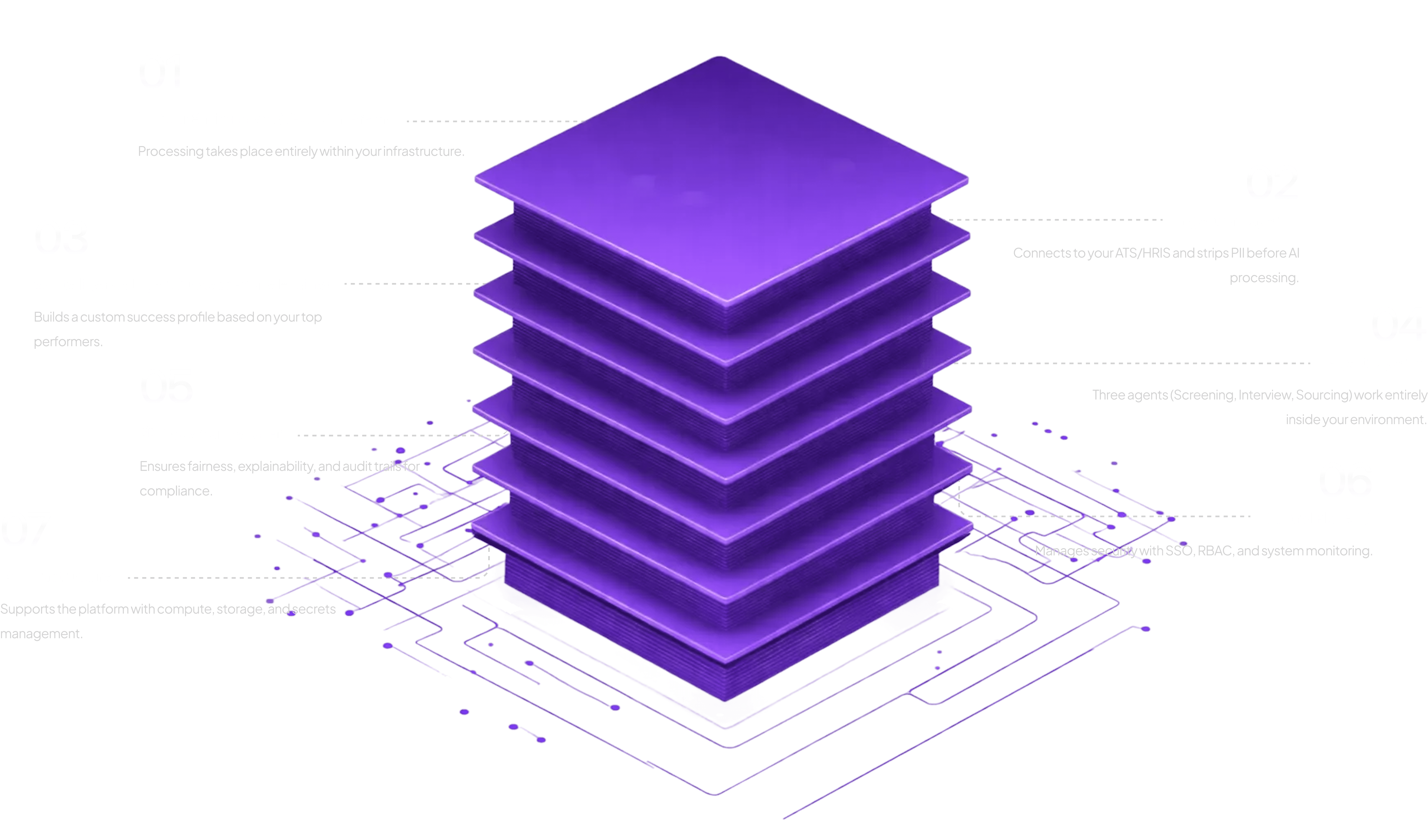 This diagram shows the NODES platform's six integrated layers, each working seamlessly to deliver AI-powered hiring inside your infrastructure.